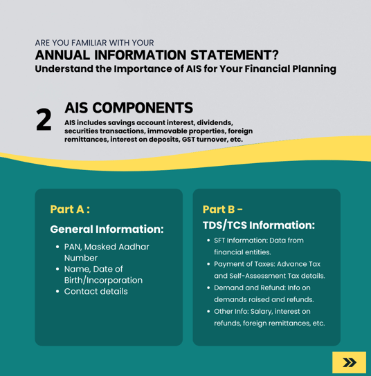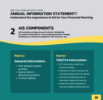 AIS offers taxpayers a detailed view of their financial transactions, including interest income, dividends, capital gains, and more. It's your gateway to understanding tax deductions, refunds, and compliance effortlessly. From PAN details to TDS/TCS information and payment records, AIS consolidates it all in one place, ensuring clarity and convenience. Stay informed about your tax obligations and financial activities with ease.
