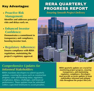 Developers are required to provide key updates on construction progress, sales status, regulatory compliance, challenges, and financial performance. These updates ensure proactive risk management by spotting and addressing potential delays early. They also boost investor confidence through transparency and help maintain compliance with RERA regulations. Timely and accurate updates keep everyone in the loop, making real estate investments safer and more reliable. Invest with confidence, knowing that RERA is committed to transparency and accountability in the real estate sector. 🏢💪